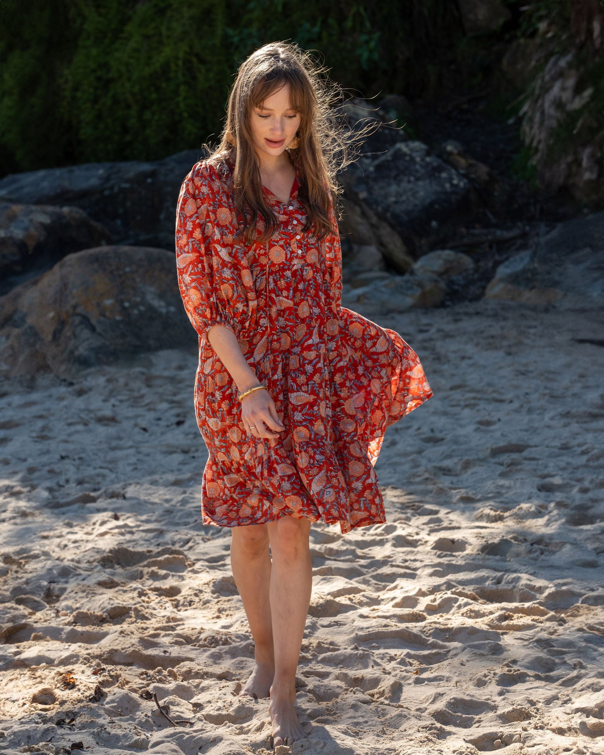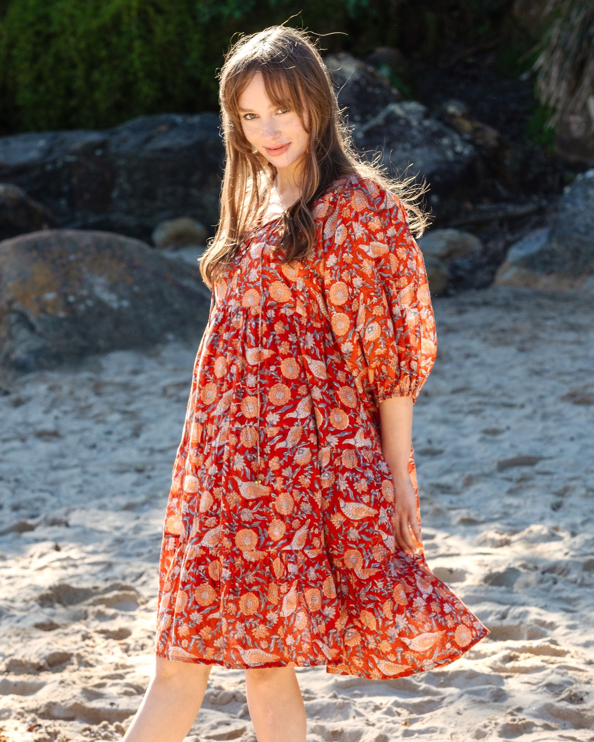 You asked and we listened! The Laal Soma print is now available in Neera Mini. Our classic bird and marigold print in red ochre and dusty orange evoke the dramatic colours of the Australian desert! This Neera Mini is lined with soft cotton which gives a beautiful flow to the dress.